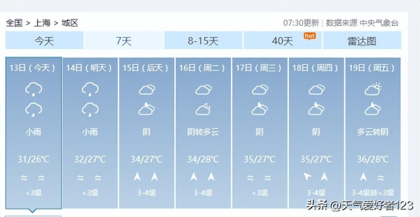 7月14日:随着雨带的南移,上海天气逐渐转好,大部分地区转为小雨转多云,气温进一步回升至27~32℃,适宜户外活动。但早晚温差较大,请注意适时增减衣物。