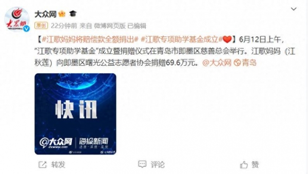 此前,据大众网消息,6月12日上午,"江歌专项助学基金"成立暨捐赠仪式在青岛市即墨区慈善总会举行。江歌妈妈(江秋莲)向即墨区曙光公益志愿者协会捐赠69.6万元。