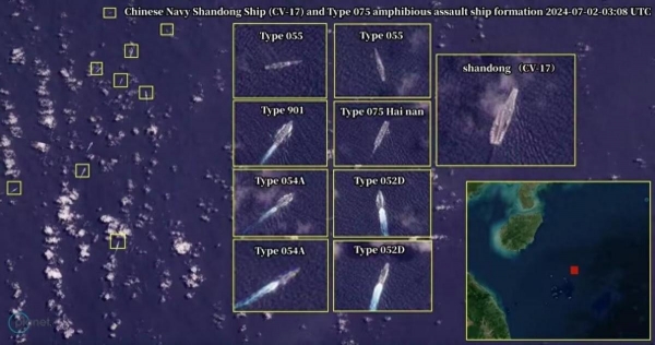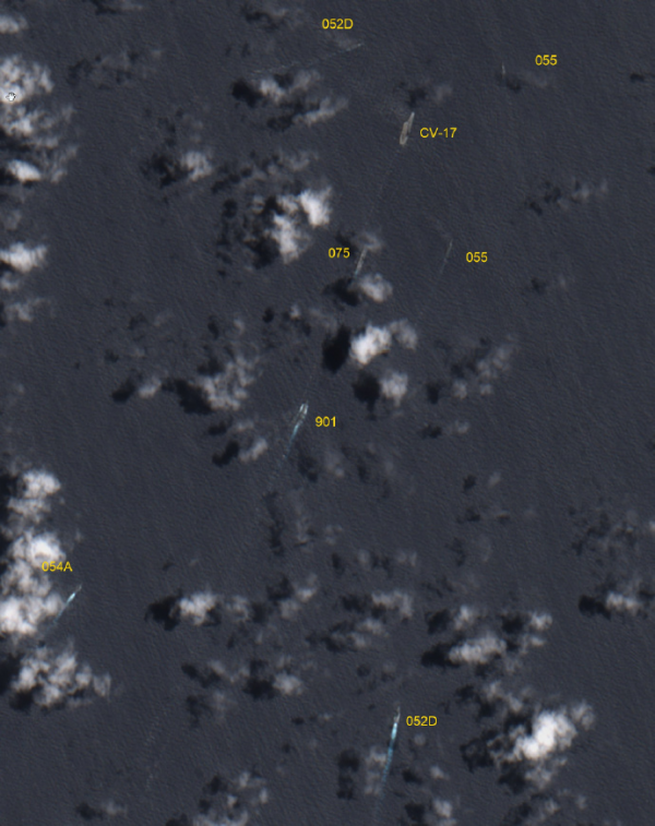 从各种渠道掌握的信息看,中国海军在南海海面上游弋的舰艇除山东舰和海南舰2艘"大舰"之外,还有数量十几艘的各型舰艇。其中包括了2艘055型万吨级大型驱逐舰、2艘052D型导弹驱逐舰和2艘054A型护卫舰。另外还有一艘用于补给的901型大型舰艇。
