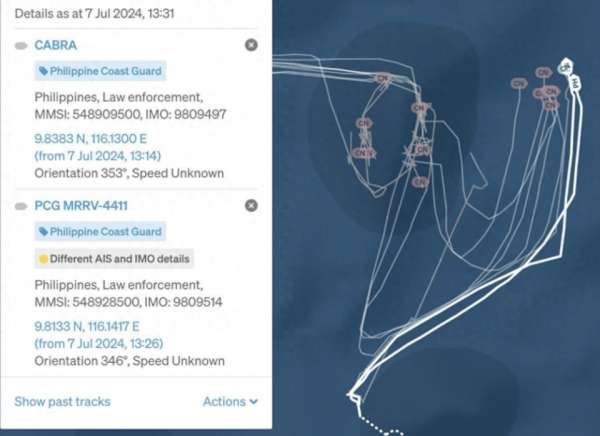 7日当天,有人通过船只航行信号图发现菲律宾海警船"卡布拉"号和"恩加诺角"号两艘巡逻舰竟然出现在仁爱礁以南18海里处。