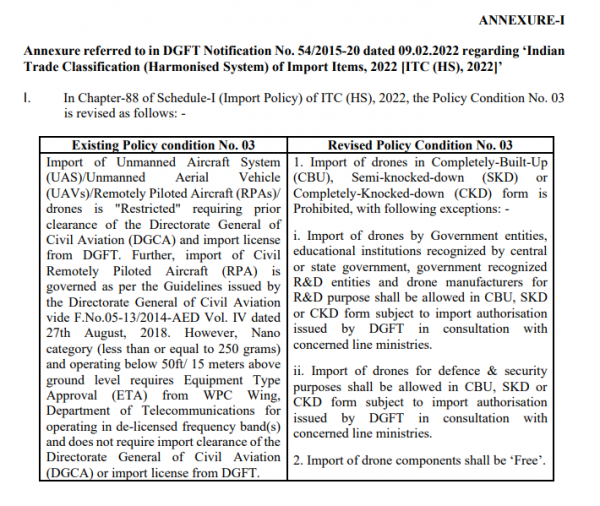 2022年2月9日,印度商业和工业部对外贸易局(DGFT)发布通知,禁止进口全组装(CBU)、全拆装(CKD)和半散装(SKD)形式的无人机,该通知立即生效。不过,出于科研、国防和安全等目的,DGFT对有些特定实体豁免无人机进口。