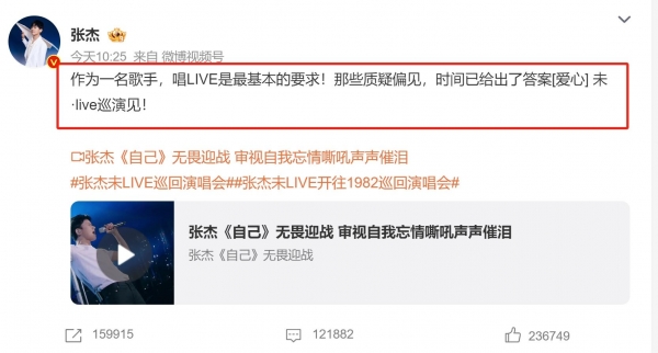 5月13日,张杰 发布自己2017年在《歌手》的演出现场,并配文:"作为一名歌手,唱LIVE是最基本的要求!瞬间冲上热搜!