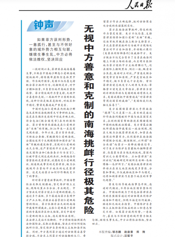 《人民日报》"敲响"钟声的举动很不寻常,因为此举只会在重大事件发生时才会作出。尤其是"钟声"文章提到"勿谓言之不预",更是中方最强力的警告。在1962年对印度,1978年对越南的两场自卫反击战,《人民日报》都曾发出这一信号。现在对菲律宾,中方没有说出这句话,但"敲响"钟声已经是最后警告!同时,中国外交部在提到菲律宾问题时,用了一个成语:悬崖勒马。很明显,中方这是再次提醒菲律宾,现在的局势已经到了悬崖边缘,进一步凸显局势的严重性!