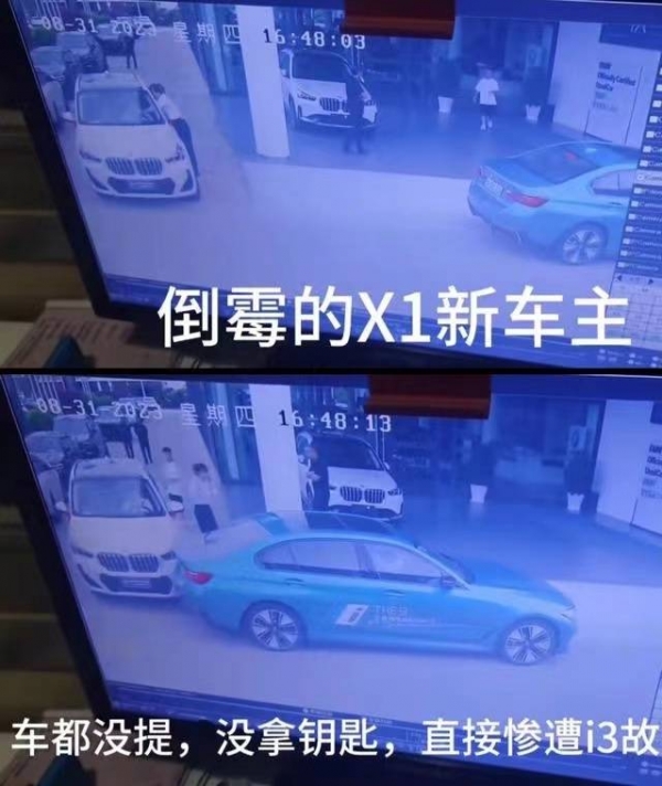 此前,8月31日邵先生发视频称,其父亲新提的宝马车在4s店被员工试驾时撞上,而店方只愿维修。监控视频中,白色宝马x1停在路口,一辆蓝色宝马i3向后倒车时,撞到白车的左前部分。据了解,蓝色宝马i3是店内试驾车,该车驾驶人为店内工作人员。