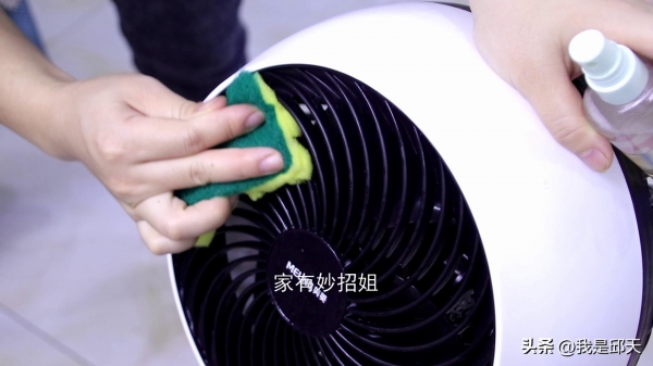 接着,我们将溶液喷洒在百洁布上,然后用百洁布来擦拭电风扇的网罩。百洁布上的小格子正好可以伸入到网罩的缝隙中,就能将污渍都清洁干净了。