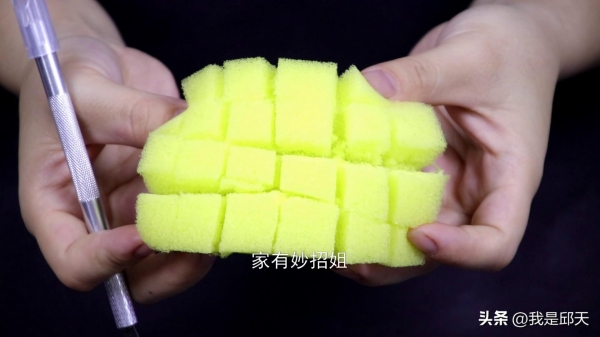 电风扇的叶片清洁好,我们再来清洁网罩的部分,网罩的缝隙非常小,只用抹布根本不能将缝隙里的灰尘清洁干净。那么这个时候我们就可以利用上一块百洁布。先用小刀在百洁布上横着划几刀,竖着再划几刀,这样就变成了百洁布上有很多的小格子。