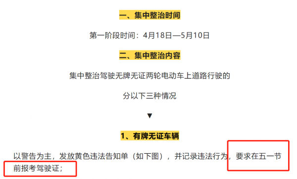 有牌无证、有证无牌、无牌无证车辆5月1日前被查,将进行书面警告;5月1日后被查,将直接采取扣车处理。