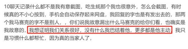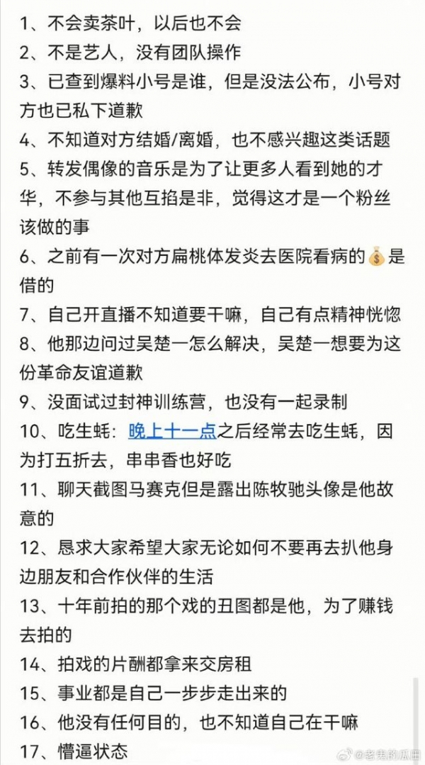 首先就是爆料他和陈牧驰照片P图的小号不是他的,号主已经被找到而且也私下进行了道歉。但吴楚一在这期间一直被网友误以为是自导自演,吴楚一直播称他和陈牧驰说了这些事,但陈牧驰不愿意帮他澄清,只等到一个律师来沟通,所以吴楚一才曝光了后面的转账记录,他想知道自己到底算什么。