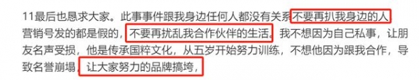 甚至就连吴楚一现在的工作、合伙人、品牌等也都被网友扒出,并对这些人的生活和品牌都造成了一定的影响,吴楚一也在直播里呼吁大家不要牵连到别人。