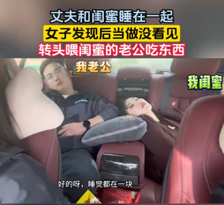 5月18日,网上传出一则视频,视频中女子闺蜜的老公在驾驶位开车,女子坐在副驾上,女子的老公和闺蜜竟在后座睡在一起了。女子对闺蜜老公说,你看他俩好的呀,睡觉都在一块,你别生气哈,就睁一只眼闭一只眼哈,我也不生气,我当看不见。女子说这话的同时还不忘喂闺蜜老公吃东西,闺蜜老公也是很配合的吃了。