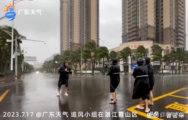 7月17日,广东省气象服务中心追风小队7月17日于湛江霞山区进行台风"泰利"报道的直播连线。(摄影/曾智琳)