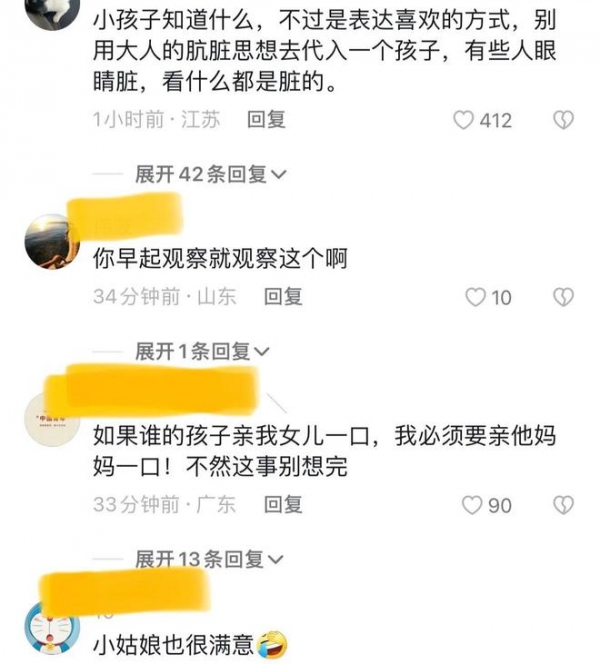 不过还有网友说,家里有男孩的家长,还是要管好自己的孩子,没有经人家允许,这样随意去亲人家的女儿,父母性格要是偏激的,非给你一巴掌不可。