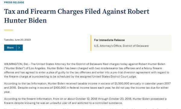 从美国司法部官网给出的材料来看,亨特涉及的违法犯罪行为包括两项涉及个税的轻罪--即他在2017年和2018年没有按法律要求为自己这两年超过150万美元的年收入缴纳个税,以及一项违法持有武器的重罪--他在2018年10月12日在10月23日吸毒成瘾期间,违法持有枪支。前两项税务方面的轻罪若被定罪,每一项的最高刑期为12个月,而后一项重罪若被定罪,最高刑期则是10年。