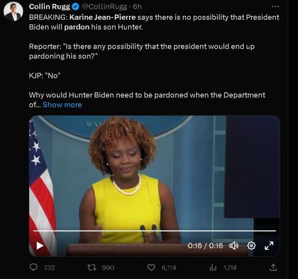 在这种局面下,在当地时间27日的美国白宫记者会上,有记者就向白宫发言人卡琳·让-皮埃尔提问,询问说倘若亨特最终被认定有罪,需要入狱,身为美国总统的拜登,是否会动用自己的特权赦免自己的这个小儿子。