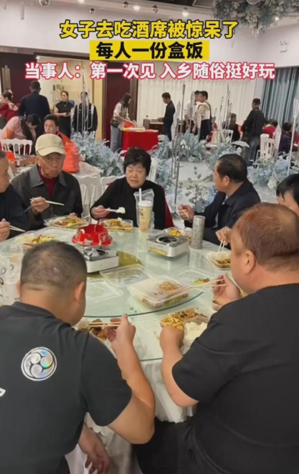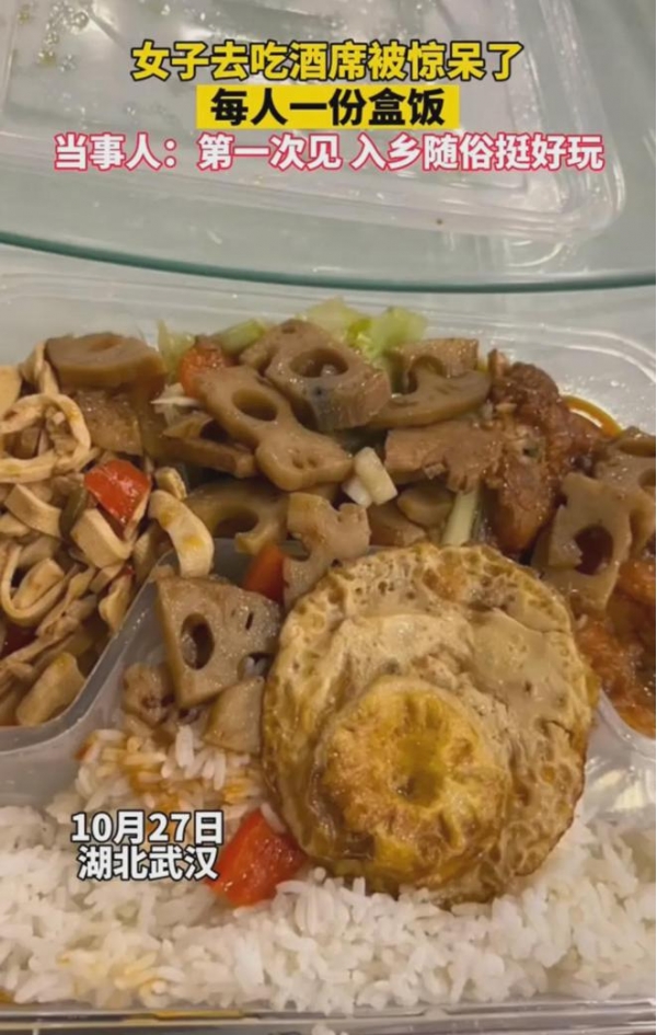 10月27日,湖北,一女子分享开开心心去吃席,没想到,人手一个盒饭,第一次见入乡随俗挺好玩。网友说,随礼二十块都多了。