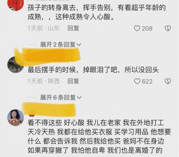 对此,有网友说, 孩子的转身离去,挥手告别,有着超乎年龄的成熟,这种成熟令人心酸。