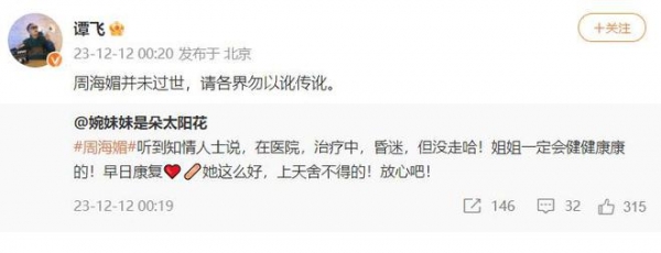 制片人谭飞也转发了一则自称来自知情人的消息,称周海媚在医院治疗中,昏迷,但没有去世。还配文写道,"周海媚并未过世,请各界勿以谣传谣",也因此,大部分网友认为该辟谣可信度极高,可以松一口气。