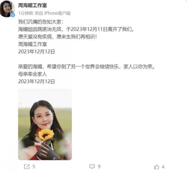 文中写道:我们沉痛的告知大家,海媚姐因病医治无效,于2023年12月11日离开了我们。愿天堂没有疾病,愿来生我们再相识!亲爱的海媚,希望你到了另一个世界会继续快乐,家人以你为荣。落款则是"母亲及全家人",评论区中,网友们纷纷扼腕,不敢相信这是真的。"我们等了这么久,还是等来了不好的消息"