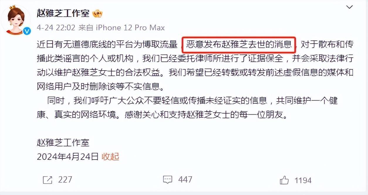 4月24日晚,赵雅芝工作室发布声明辟谣网传赵雅芝去世的消息,并表示会采取法律行动维权。当时看到工作室的辟谣后,网友们都非常震惊,但赵雅芝本人迟迟没有发声,大家还是忍不住担忧。