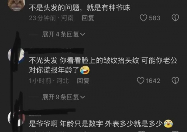 还有网友调侃,你可能被骗了,你老公肯定对你谎报年龄了,这样子看上去六十岁都不为过。