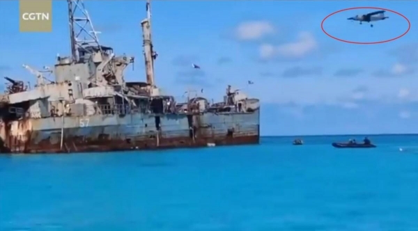 据环球网报道,2日我国媒体发布了一段海警部门在仁爱礁执法的现场视频,可以看到一架菲律宾飞机向"马德雷山"号空投补给后,我国海警执法艇试图抵近取证时,遭到菲"坐滩"军舰上两名人员持枪威胁。