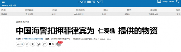 3日菲媒《每日问询者报》援引匿名菲军方人士消息称,5月19日中菲在仁爱礁实际上发生了两起摩擦事件:其一,如我国媒体发布的视频所示,当时菲律宾飞机空投的物资并没有准确落在"马德雷山"号上,我国海警在仁爱礁附近部署了4艘执法艇,成功扣押并没收部分散落物资,然后将其撒入海中。