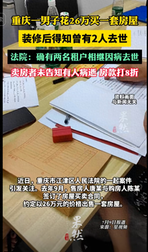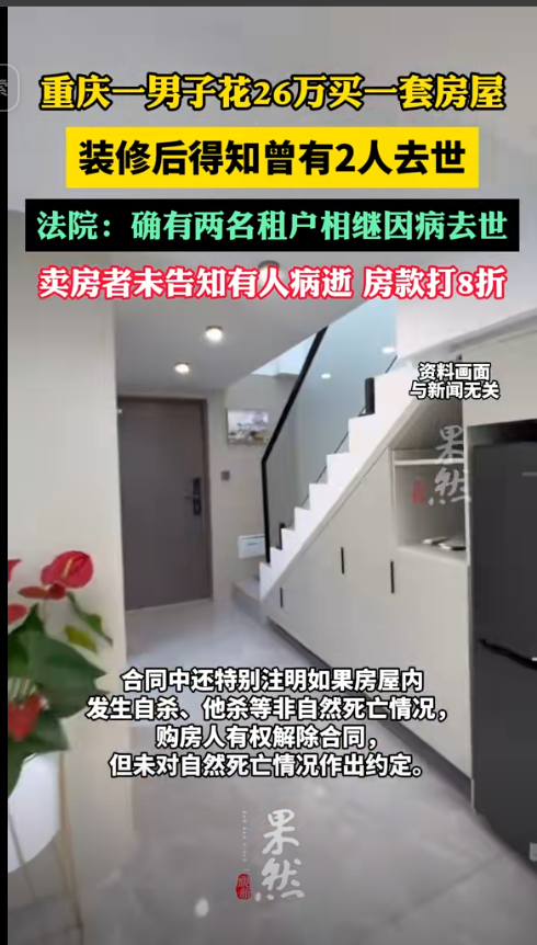 近日,重庆市江津区人民法院的一起案件引发关注,去年9月,售房人唐某与购房人陈菜签订了房屋买卖合同约定以26万元的价格出售一套房屋,合同中还特别注明,如果房屋内发生自杀、他杀等非自然死亡情况,购房人有权解除合同,但未对自然死亡情况作出约定。
