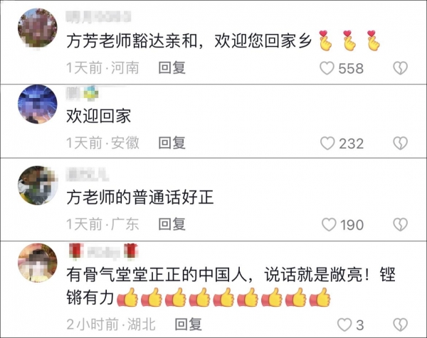 评论区里,大陆网友对方芳的祖国自豪感表示认同。