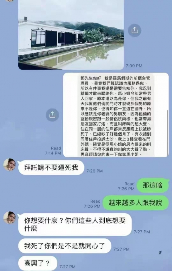 在郑先生和马筱梅的聊天截图中,郑先生截图转述了罗马假期前柜台管理员的一段爆料,说是马筱梅带着新男友入住的几个月里,吵得同一层的住户多次投诉,但马筱梅依旧我行我素。