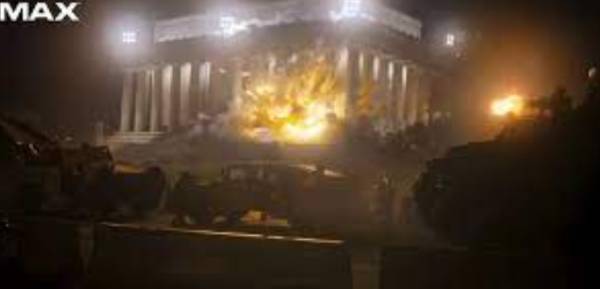 第二个场景是电影最后一部分首都华盛顿的战争场面--叛军炮轰林肯纪念堂。如果去过华盛顿旅游的人一定会被美国首都一系列政府建筑的风格所吸引,它们几乎都是清一色的仿罗马建筑,尤其是从国会到方尖碑再到林肯纪念堂的那条中轴线--无论纽约的高楼大厦多么摩登,华盛顿特区都在用行动告诉你,美国就是那个赤裸裸宣称自己是西方文明新灯塔、新大陆上新罗马的国家。如果说叛军的目的只是干掉总统、占领特区,那么炮轰这样一个"景点"显然没有实际意义,但导演安排了,自然是象征性大于功能性。