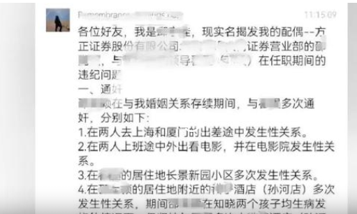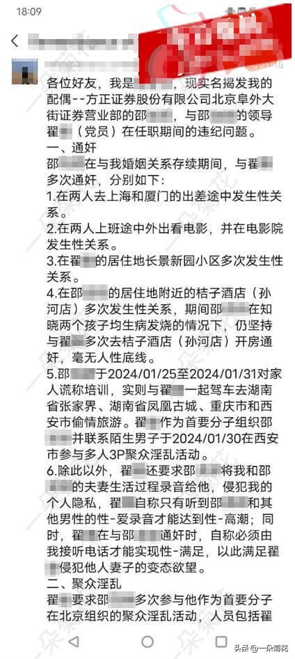 近日,一则方正证券女员工出轨领导的新闻冲上热搜。该女员工被丈夫实名举报,存在与男领导长期通奸、聚众淫乱、特殊性癖好等行为,内容触目惊心,行为病态丧失道德底线。