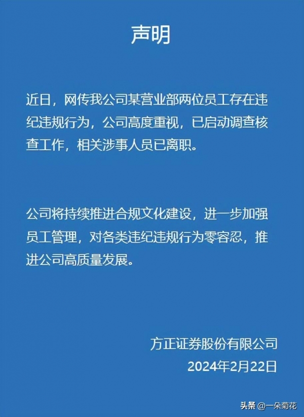 方正证券回应称涉事员工已离职,公司已经启动内部核实程序,尽快查明事实。