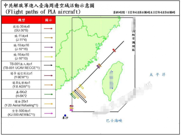 随后台防务部门会将整个解放军当天在台岛活动的情况汇总成一张示意图,并且详细标注解放军各种军机的类型、具体的型号和飞机在台岛周边当天活动的航迹。