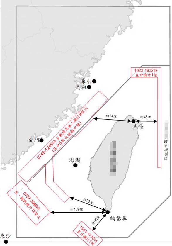 2021年解放军台海活动的示意图,台军还明确标注了解放军军机类型和活动航迹