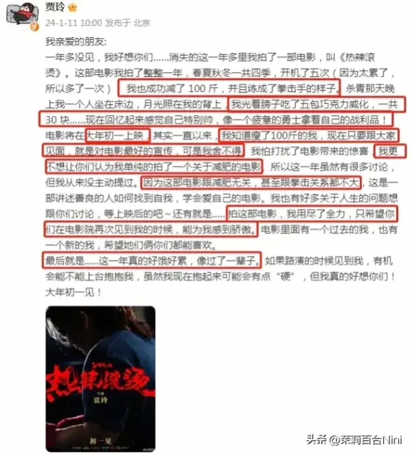 贾玲隐身1年首发文!暴瘦100斤,新电影杀青狂吃30块巧克力,决定进入了闭关状态,定档大年初一。