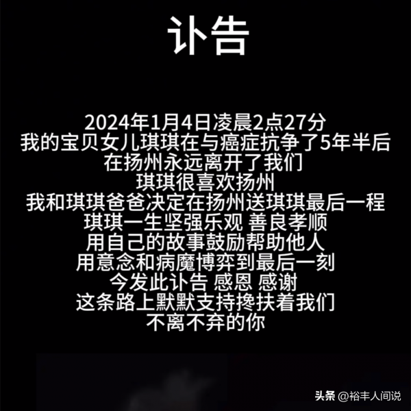 讣告中,琪琪弗的妈妈这样写道:2024年1月4日凌晨2点27分,我的宝贝女儿琪琪在与癌症抗争了五年半后,在扬州永远离开了我们,琪琪很喜欢扬州,我和琪琪爸爸决定在扬州送琪琪最后一程,琪琪一生坚强乐观,善良孝顺……