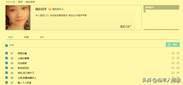 从其简介中不难发现,她曾演唱过诸多优秀的歌曲,比如说《相思的痛》、《父亲的肩膀》、《白发亲娘》、《新年旺旺旺》、《爱一个人好难》。