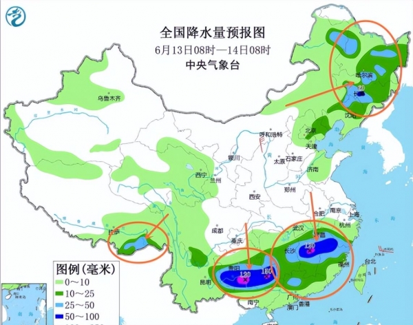 6月13日,内蒙古东北部、黑龙江西南部、东北地区中东部等地有中到大雨,部分地区有暴雨或大暴雨。而到了6月14日,东北地区东部、辽宁中北部、江南大部等地有中到大雨,部分地区有暴雨或大暴雨,需提前做好防范准备。