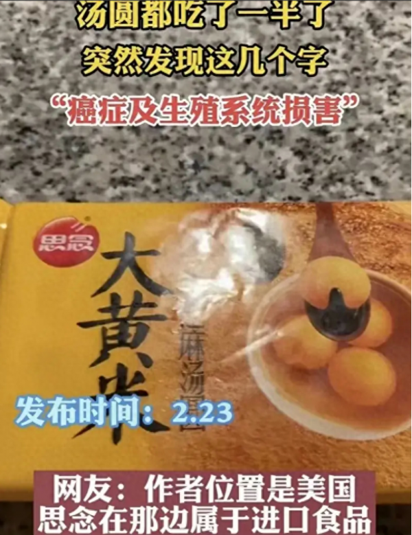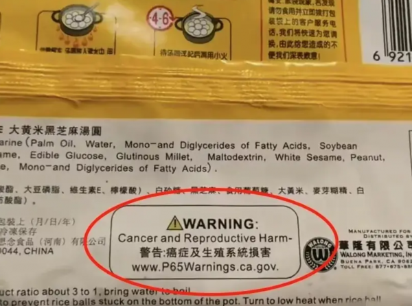 美国一位华人女子,在当地亚洲超市买到中国产的大黄米芝麻汤圆。回到家里正准备享用的时候,一个"WARNING"(警告)字样赫然出现在包装背面,"癌症及生殖系统损害"也像一根刺一样刺进她的心里。