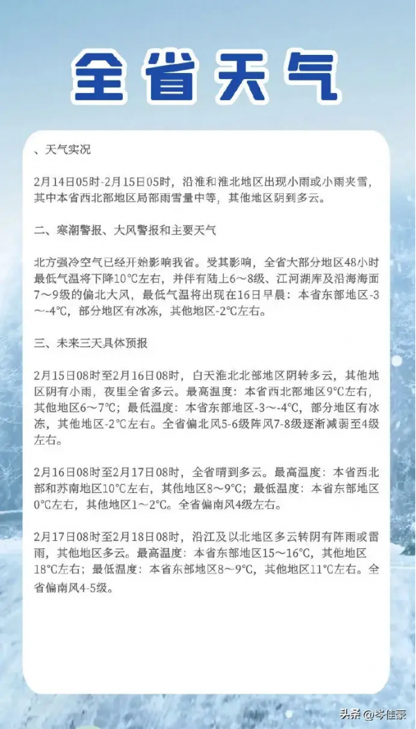 降温10℃!江苏发布寒潮黄色预警
