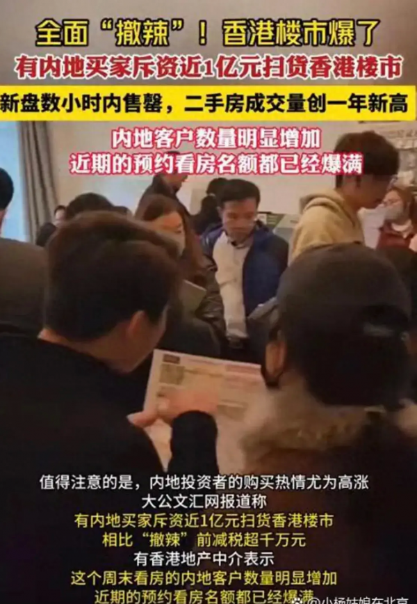 然而,这场"扫货盛宴"并非只有内地买家参与。事实上,香港本地的购房者也积极加入到这场购房热潮中。许多人认为,随着辣招的取消,香港楼市将迎来新的发展机遇,房价有望稳步上涨。