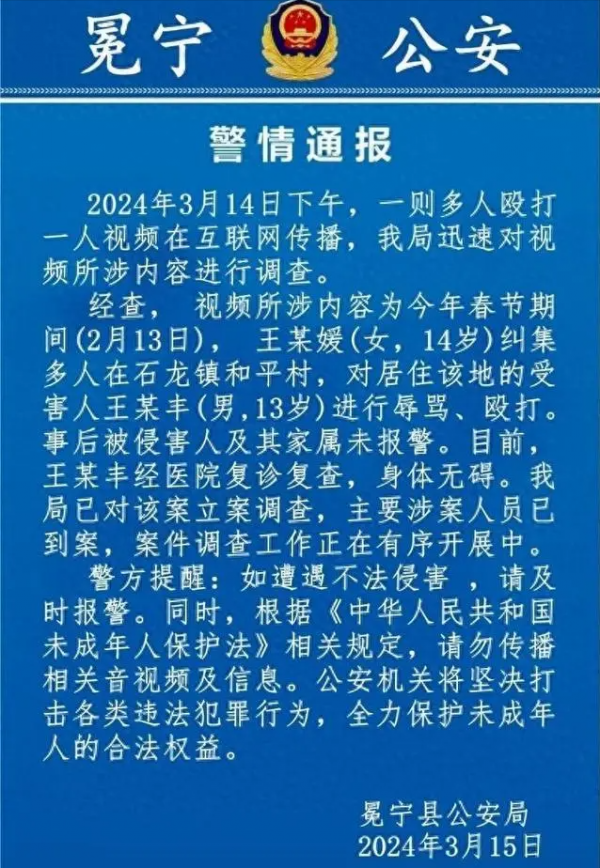 据警方透露,其中主要的组织者是一名14岁的女孩,她的名字是王某媛。她不仅纠集了一帮人,还亲自对王某丰进行了殴打和辱骂。这种恶劣的行为实在令人心寒,尤其是这群孩子的年纪还如此的幼小。