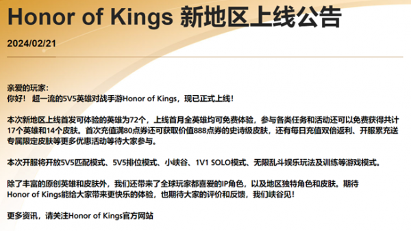 《王者荣耀》海外服(Honor of Kings)》在去年登陆巴西等市场之后,今年这款游戏开始在其他海外市场上线,其自2月底开始进入土耳其、沙特阿拉伯等市场,预计在今年贡献更多收入。