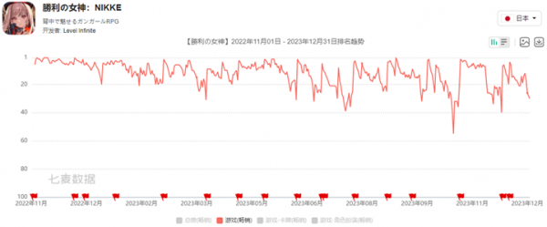 日本市场是《GODDESS OF VICTORY: NIKKE》表现最优异的市场,去年贡献了该游戏近一半的收入,韩国(22%)和美国(15%)紧随其后。从日本iOS畅销榜排名来看,该款游戏截至去年12月仍保持在TOP40,在版本更新的推动下常常能挤进TOP3。