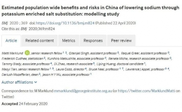 《英国医学杂志》上发表的一项由北京大学进行的研究指出,如果在我国使用含25%氯化钾的低钠盐代替食盐,或可降低收缩压5mmHg、舒张压2mmHg,每年可减少45万的心血管疾病死亡,约占比11%。
