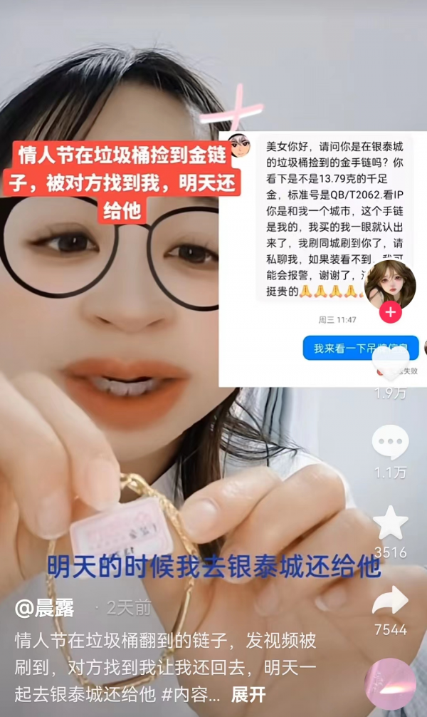 据小编了解,陈女士情人节当天在当地银泰城的垃圾桶里捡到了一条金手链和一只兰蔻的口红,甚至还有520元的现金红包!据其透露,这条金手链是一条重达13.79克的足金手链,据陈女士所说,但是这三样东西都藏在一束花里,当事人可能没看到便将花扔掉了,在捡到当天,陈女士便在网络媒体上发布视频,炫耀其当天的收获。
