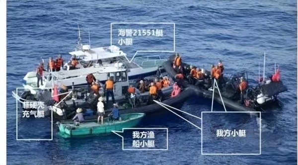 值得一提的是,就在美菲日加四国联合军演开幕的当天,经历换帅风波的菲律宾西部军区派出多艘运补船与充气艇,企图想以硬闯的方式向非法坐滩在仁爱礁内的"马德雷山"号登陆舰上的菲海军官兵运送补给。我方对此予以严正警告,不料菲海军充气艇不仅置若罔闻,且多次做出危险举动接近我方海警舰艇,对此我方海警重拳出击,一边对菲海军充气艇实施登临检查,一边对菲海军官兵实施缴械。
