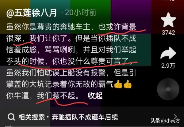 同时,她的文案也充满内涵,描述奔驰车主背景深厚,自己惹不起,不打算报警处理,反手却将视频上传网络……