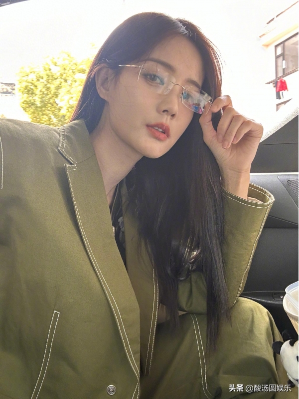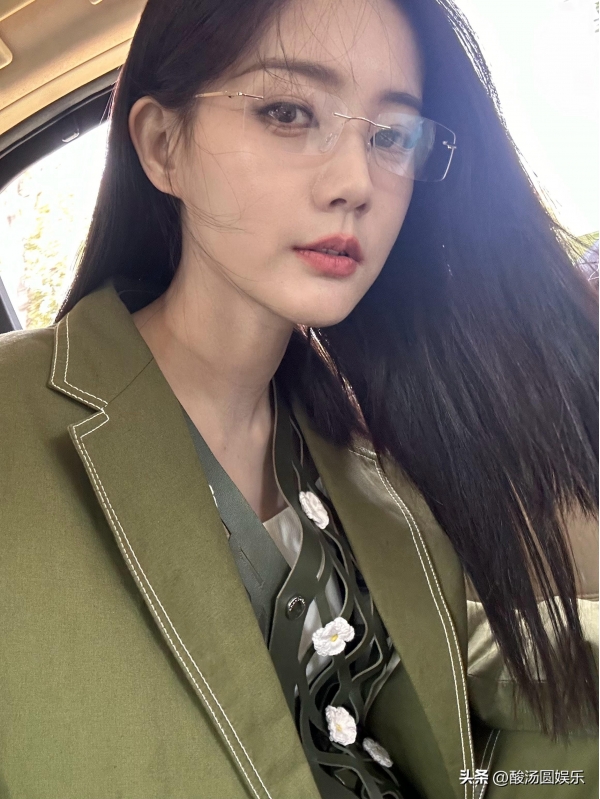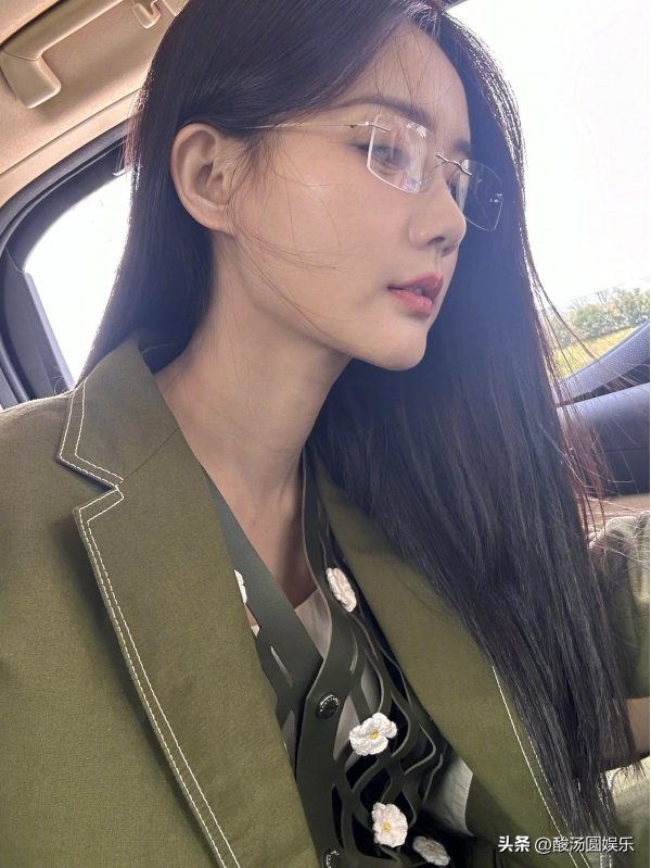 从照片中可以看出,李一桐的穿着十分考究。绿色西装剪裁合身,线条流畅,既展现了她的身材曲线,又彰显了她的干练气质。透明眼镜的点缀更是为整体造型增添了一抹文艺气息,让人仿佛看到了都市中独立自信的现代女性形象。