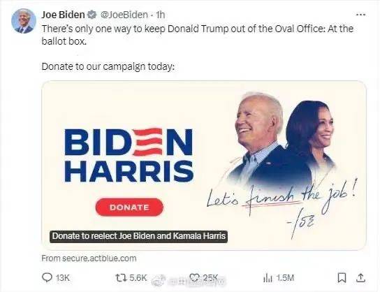 针对美国前总统特朗普在"封口费"一案中被陪审团裁定34项罪名全部成立一事,美国总统拜登方面进行了回应。拜登在社交媒体上发文称,只有一种方法可以让特朗普远离白宫:通过投票箱。拜登竞选团队在一份声明中称,判决结果表明,"没有人可以凌驾于法律之上"。